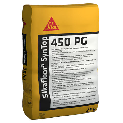 Sikafloor® SynTop-450 PG on esisekoitettu, käyttövalmis, pumpattava, kaadettava, korkealujuuksinen korundipohjainen päällyste raskaasti kuormitetuille lattioille sekä sisä- että ulkotiloissa. Sikafloor® SynTop-450 PG on sopiva karkeiden ja epätasaisten betonilattioiden tasoittamiseksi 8 – 50 mm paksuisena kerroksena. Sikafloor® SynTop-450 PG on muodostettu portlandsementistä, jota on vahvistettu PAN (polyakryylinitriili) -kuiduilla, sekä mineraalirunkoaineista, joilla on korkea kovuus sekoitettuna korundin kanssa. Tuotetta voidaan levittää tuoreelle ja olemassa olevalle (vanhalle) betonille. Sikafloor® SynTop-450 PG:n kromaattipitoisuus (Cr-VI) on alhainen, ≤ 2 ppm sementin painosta.