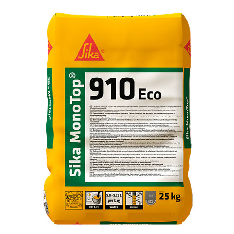 Sika MonoTop®-910 Eco on 1-komponenttinen, sementtipohjainen polymeerimodifioitu tartuntalaasti ja korroosionestolaasti betoniteräksille. Pienennetty hiilijalanjälki kierrätysmateriaaleja sisältävän erikoiskoostumuksensa ansiosta.